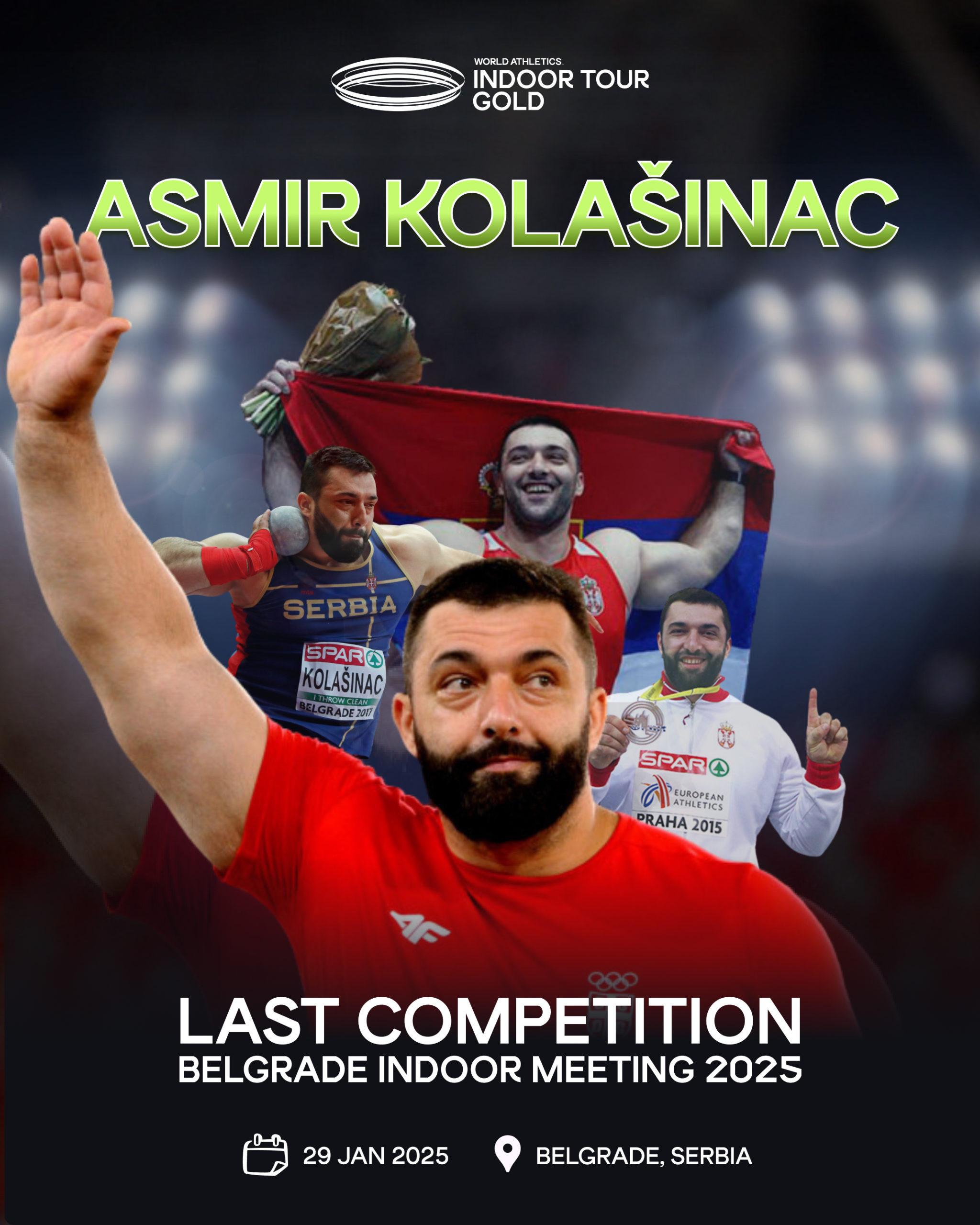 Poslednji hitac na takmičarskoj sceni bacač kugle svetske klase, poznat po svojoj harizmi, osmehu, snazi, tehnici i doslednosti, trofejni div srpske atletike Asmir Kolašinac uputiće na „Gold Belgrade Indoor Meeting” 29. januara 2025. Atletska dvorana u Beogradu ugostiće svetske asove atletike, a Beogradski atletski miting na jubilarni 10. rođendan imaće prefiks zlatni, čime se naš glavni grad svrstava među svega devet elitnih dvoranskih mitinga na svetu. Pretižni turnir biće oproštajno takmičenje reprezentativca Srbije Kolašinca kojim završava 20 godišnji put u veoma bogatoj karijeri tokom koje je ostavio zlatni pečat u istoriji srpske atletike. Uz brojne medalje i uspehe ostaće zauvek upamćen kao sportski atletski as velikog srca, sportista koji je na borilištu uvek dao maksimum, koji je bio i ostao predan putu koji je izabrao. Isto je činio i van sportskih terena gde se uvek i rado uključivao u humanitarni rad i akcije i davao svoj doprinos u pomoći drugim ljudima.