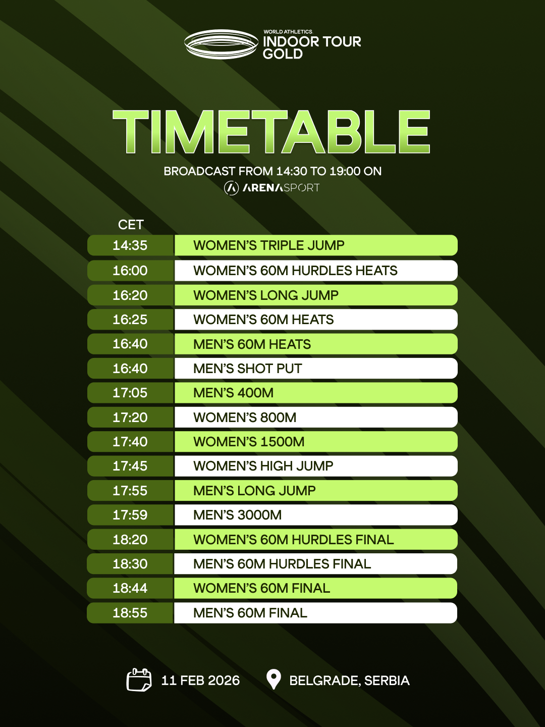 On February 11, 2026, starting at 2:30 PM, the Athletics Hall in Banjica will host the world’s elite at the very beginning of a season filled with high expectations. Many of the athletes arriving in Belgrade have worked tirelessly to pursue their dreams and goals — records on the athletics runway.